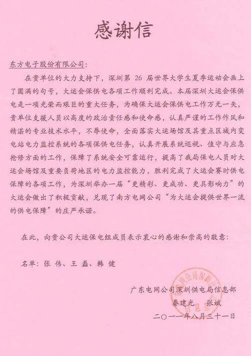 8月23日,世界大学生运动会在深圳圆满落幕,长沙耐得丽科技有限公司作为大运会唯一保电企业见证了世界大学生体育运动的蓬勃发展。长沙耐得丽科技有限公司技术中心系统部与工程部坚守“忠于职守,全力以赴,誓保大运电网安全”的信念,联手实现了大运保供电期间系统零故障、零缺陷的目标。